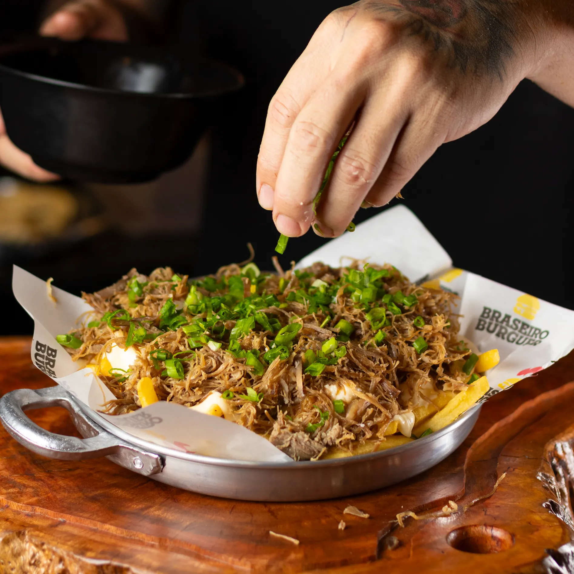 150G BATATA, FUNDUE DE QUEIJOS BRANCO, CARNE DE SOL DESFIADA E CEBOLINHA.
